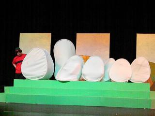 Lillian and her fellow baby ducks sat for a good 20 minutes in these “eggs” I made. I took me awhile to dream up how to create eggs the actors could “hatch” from. I finally used, fleece and hula hoops. Don’t ask. It was pretty crazy that worked. I even made a “double-yolker” that two kids “hatched” from. In all, I’d say the eggs were a hit.