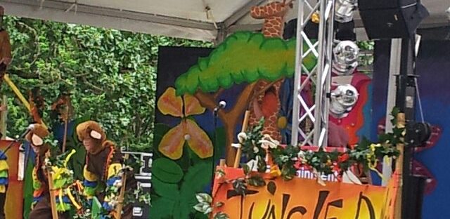 | Kids and volunteer parents made the crazy flowers we hung on the back. |