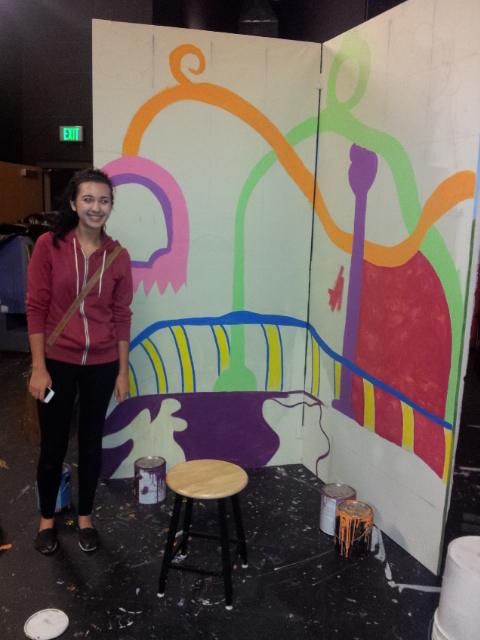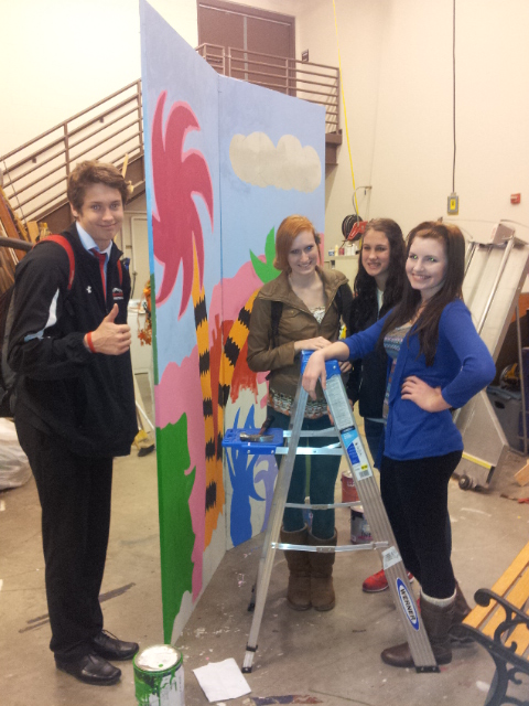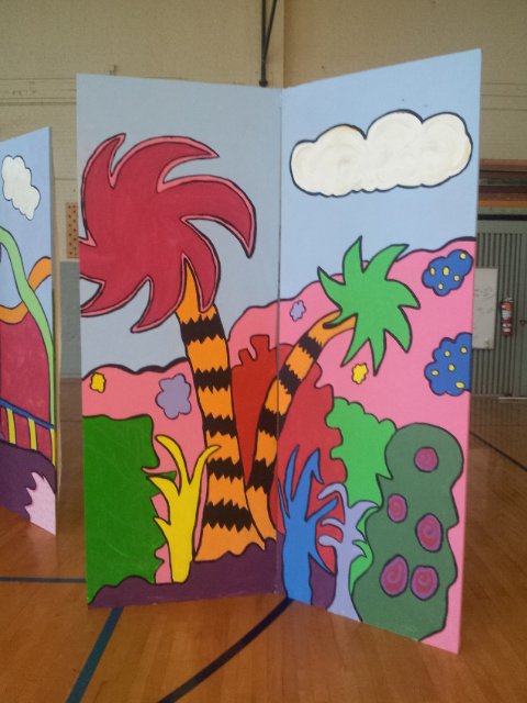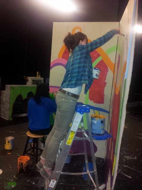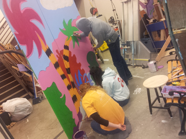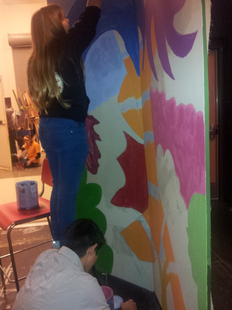 After approval, I went to the Central High School Tech Theater class and offered to teach them painting techniques in exchange for their help. After painting a base coat on the 6 flats, I taught the kids to grid the flats and to copy the drawing. We worked on brush techniques smooth strokes scrubbing, color choice, and care of brushes.