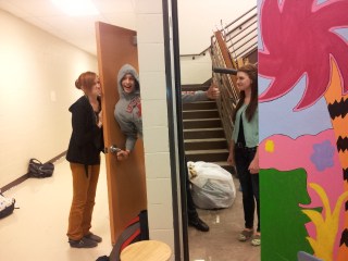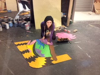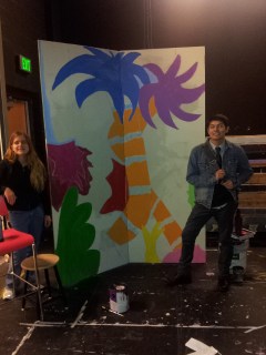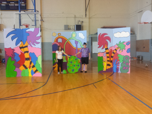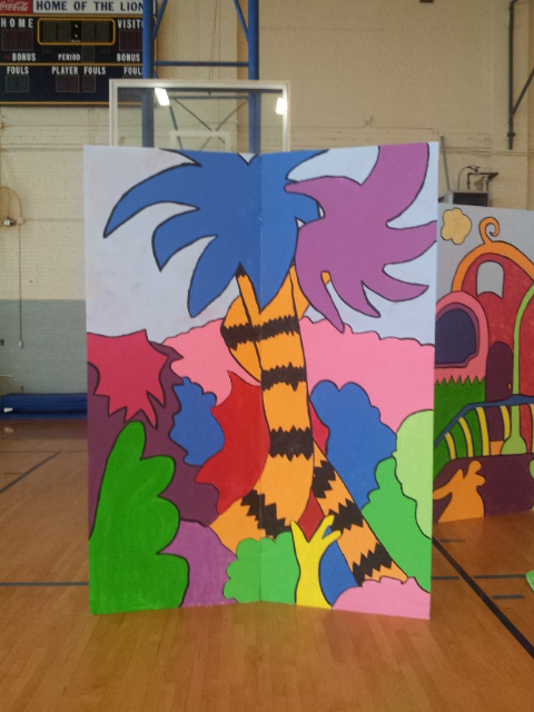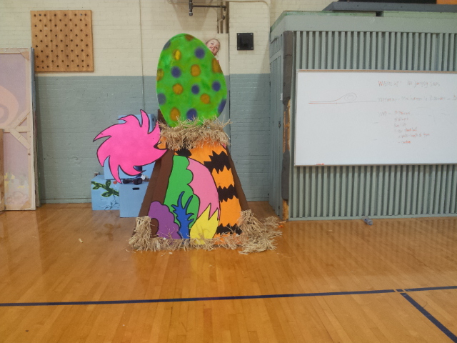 I also designed a nest in a tree. I used some CET stairs and covered the front with a pained bent over tree. Lillian and I went to the school and attached the front to the stairs. We added pieces of Hawaiian skirt to create the nest. We also painted one of the eggs I made for Honk so that there would be an egg to “hatch” a baby Horton, and Kimber helped me to create a small egg for Horton to hold at the beginning of the show.