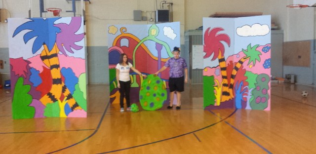 Back in October my friend, Robert, ask me to design Suesical the Musical Jr. for his middle-school class. The set needed to be easily moved… they practice in a gym and then perform on a stage. They do not have time to “build” a set because the stage belongs to the high school. Kids need to be able to move it, so it needed to be light. I started by drawing out the “look” I wanted for the 6 flats I would borrow from CET.