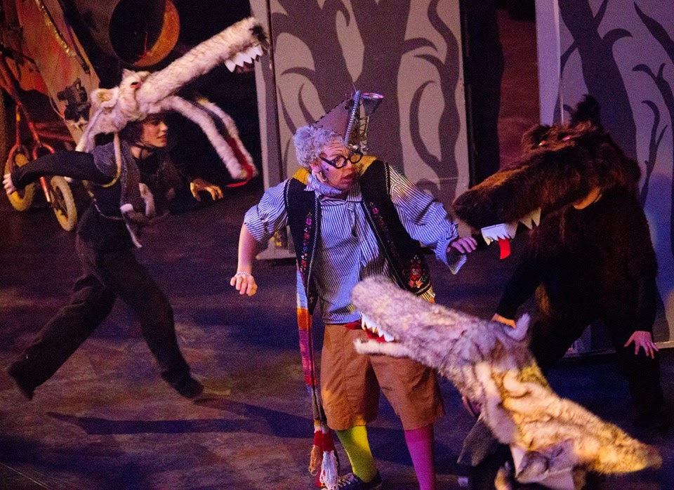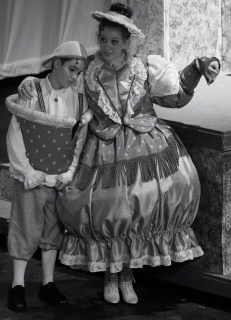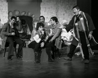 I also brought over tables, costumes, the “jail”, assorted props, and the rolling flats we used for the village at CET. The back hall began to fill up.