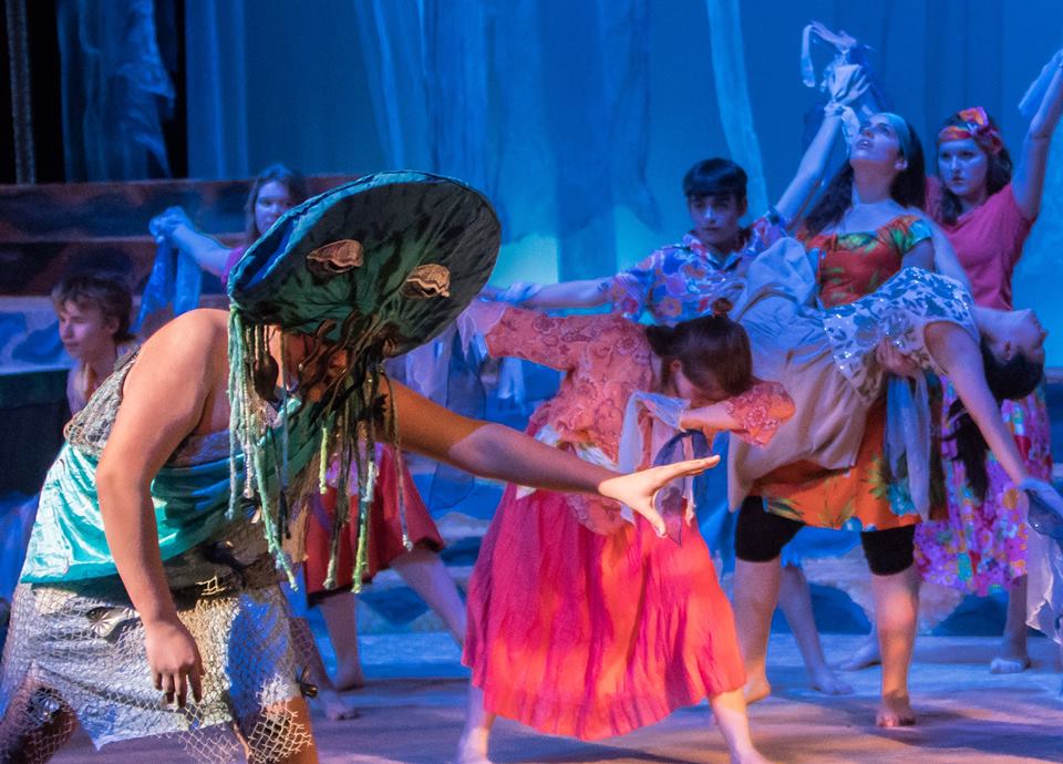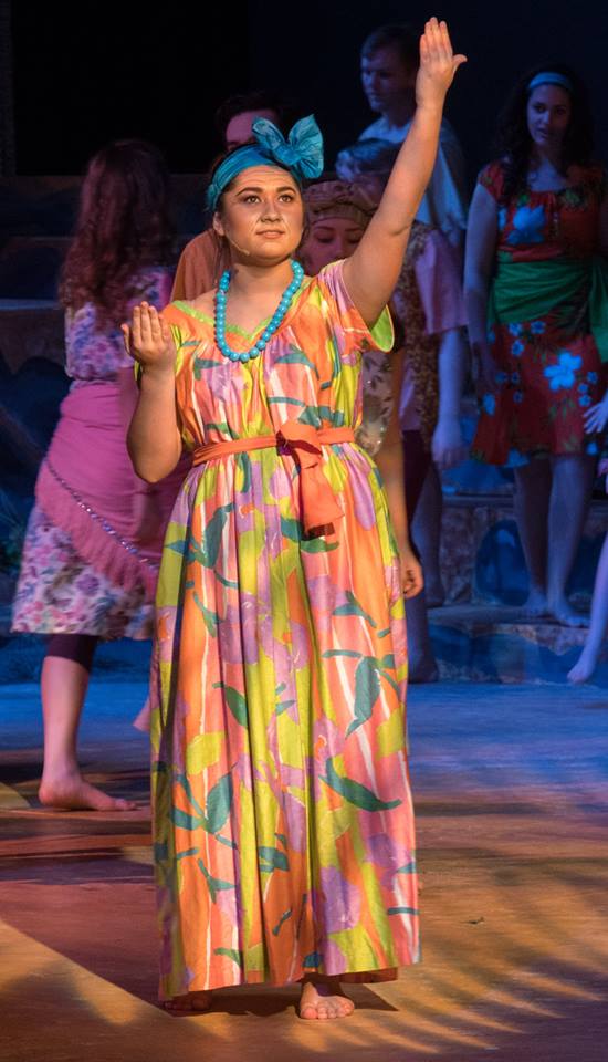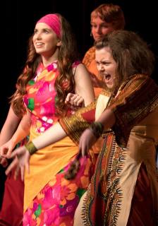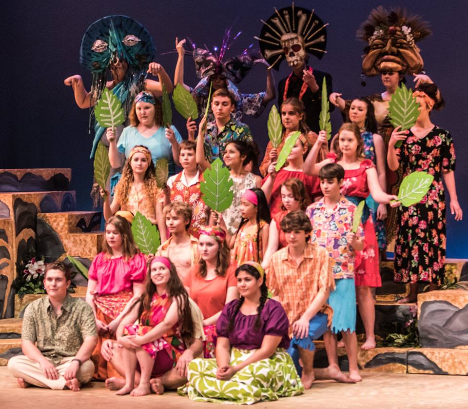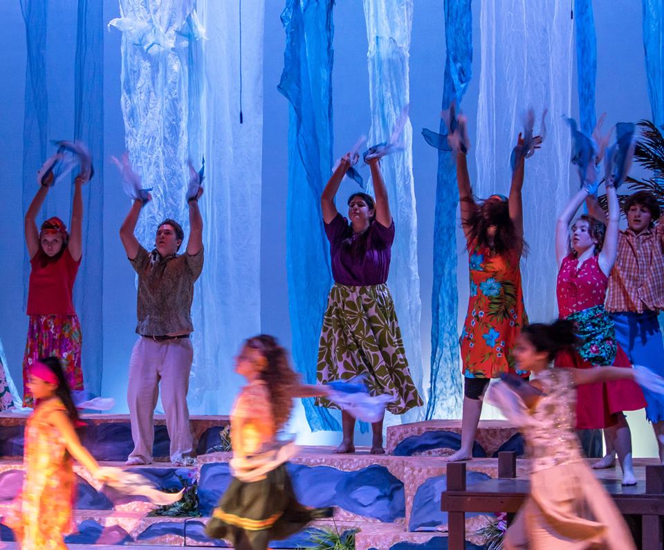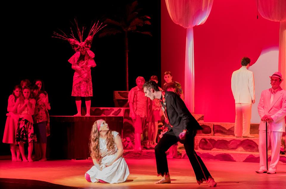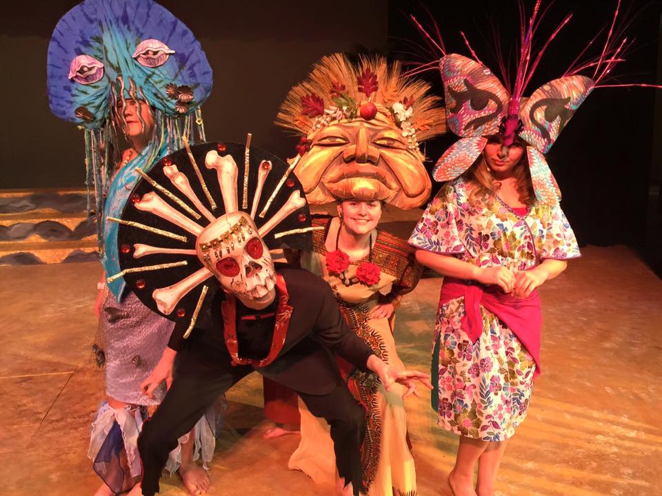 In addition to the challenge of having a set that needed to move on and off stage…. daily… and the need to share the space with so many other events (there was a concert the nigh before we opened), I needed to come up with a vision for the show. I have a soft spot in my heart for Polynesia because of my auntie Marara so the show took on more a Pacific Island feel. I figure it was ok because the French settled island in the Pacific too, even if the show was really written for island in the Caribbean. I also decided to have the “gods” represented in masks. I saw them as the puppet masters of the rest of the story. Jeff found someone to create the masks. They were fantastic! Even better, the cast members mastered acting with the masks. They were able to move so that you could believe that the mask had the expression and the motivation for the action. These four kids were amazing!
