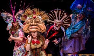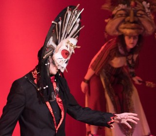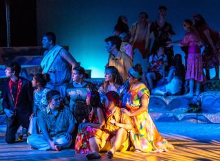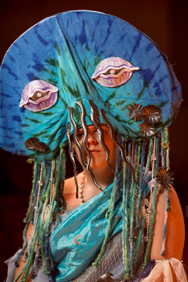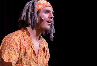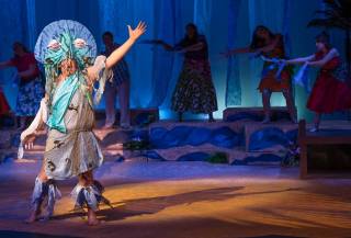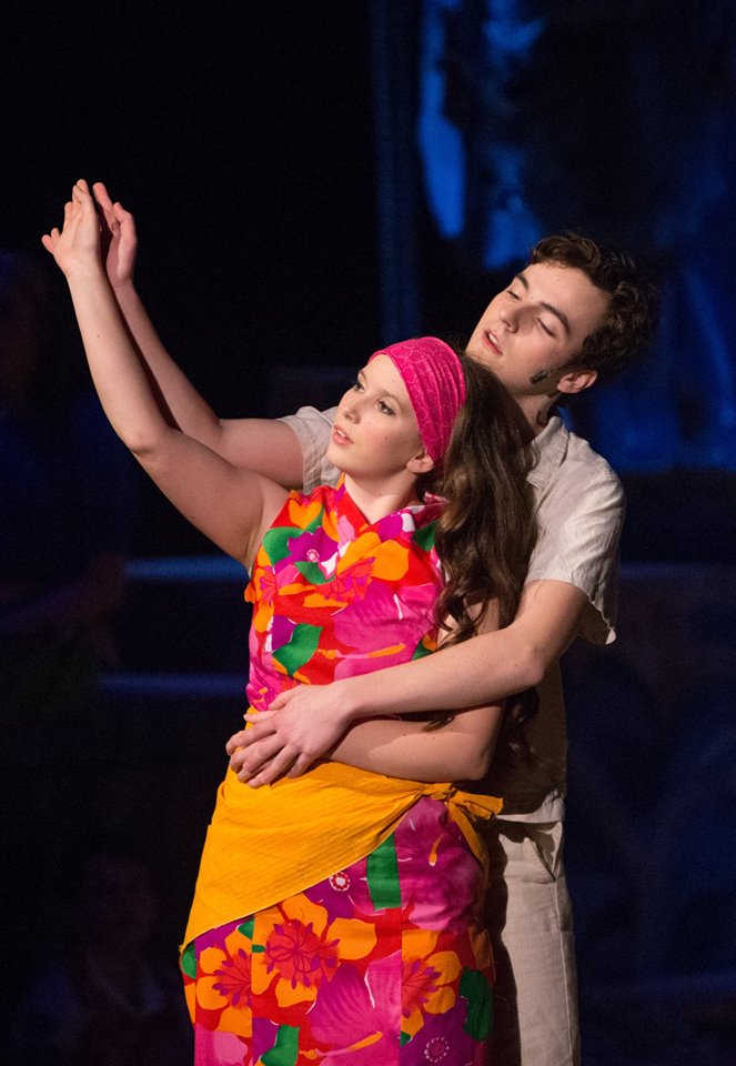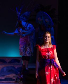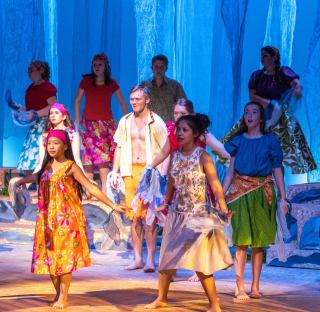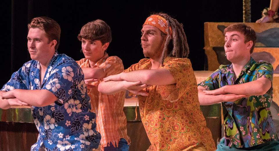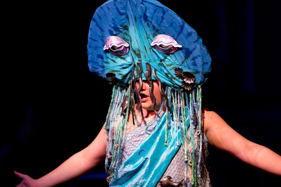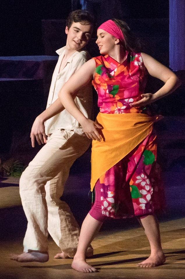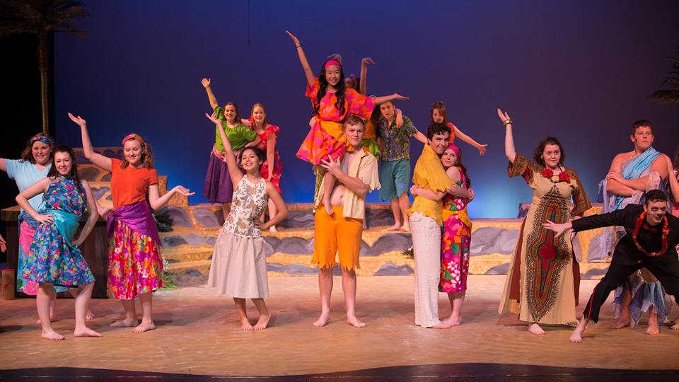 In addition to the challenge of having a set that needed to move on and off stage…. daily… and the need to share the space with so many other events (there was a concert the nigh before we opened), I needed to come up with a vision for the show. I have a soft spot in my heart for Polynesia because of my auntie Marara so the show took on more a Pacific Island feel. I figure it was ok because the French settled island in the Pacific too, even if the show was really written for island in the Caribbean. I also decided to have the “gods” represented in masks. I saw them as the puppet masters of the rest of the story. Jeff found someone to create the masks. They were fantastic! Even better, the cast members mastered acting with the masks. They were able to move so that you could believe that the mask had the expression and the motivation for the action. These four kids were amazing!