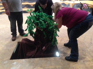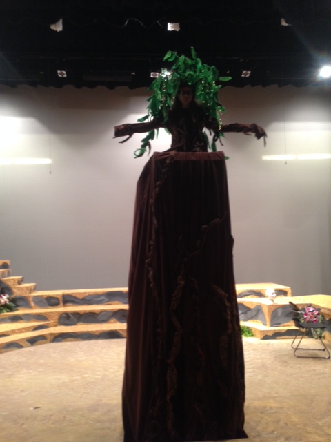 I also wanted TiMoune, the romantic lead, to turn into a tree. My friend John Hatch rebuild the trap door for me. We borrowed the school cherry picker from the generous custodian, Justin and my friend Bree created a “dress” to make it happen.