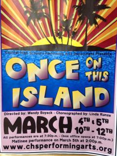 I had the great honor of directing Once on This Island at Central High School which performed the first couple weeks of March. The show was added to the season after many students requested one more chance to do a show before the end of their senior year. I didn’t start off directing the show. I started off in my usual “helping” role. However, after the show was cast, and I had come up with a scene/role break down because I had done the show before, and the the director, Jeff, realized that life was super busy, I was asked to take the lead. I love this show. It speaks to me. Of coarse I would take on the responsibilities of directing the show!