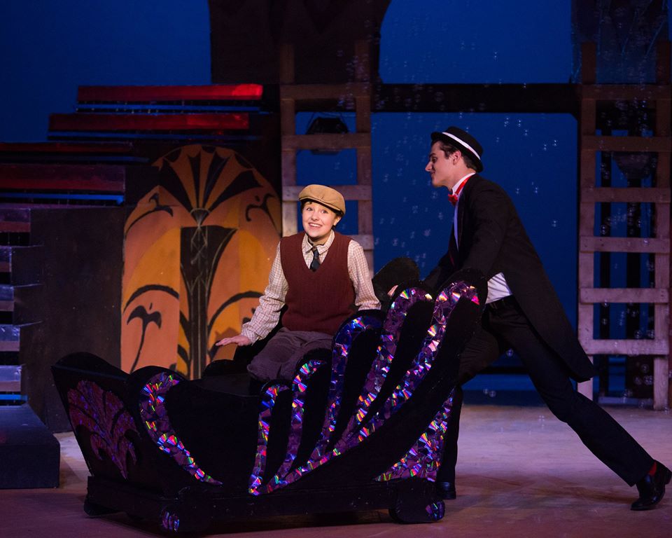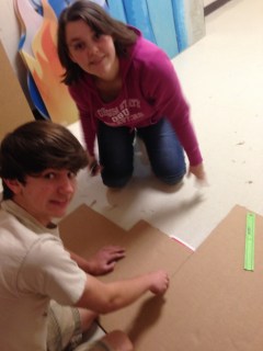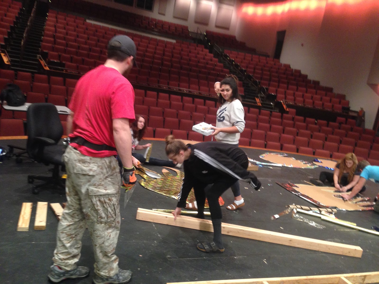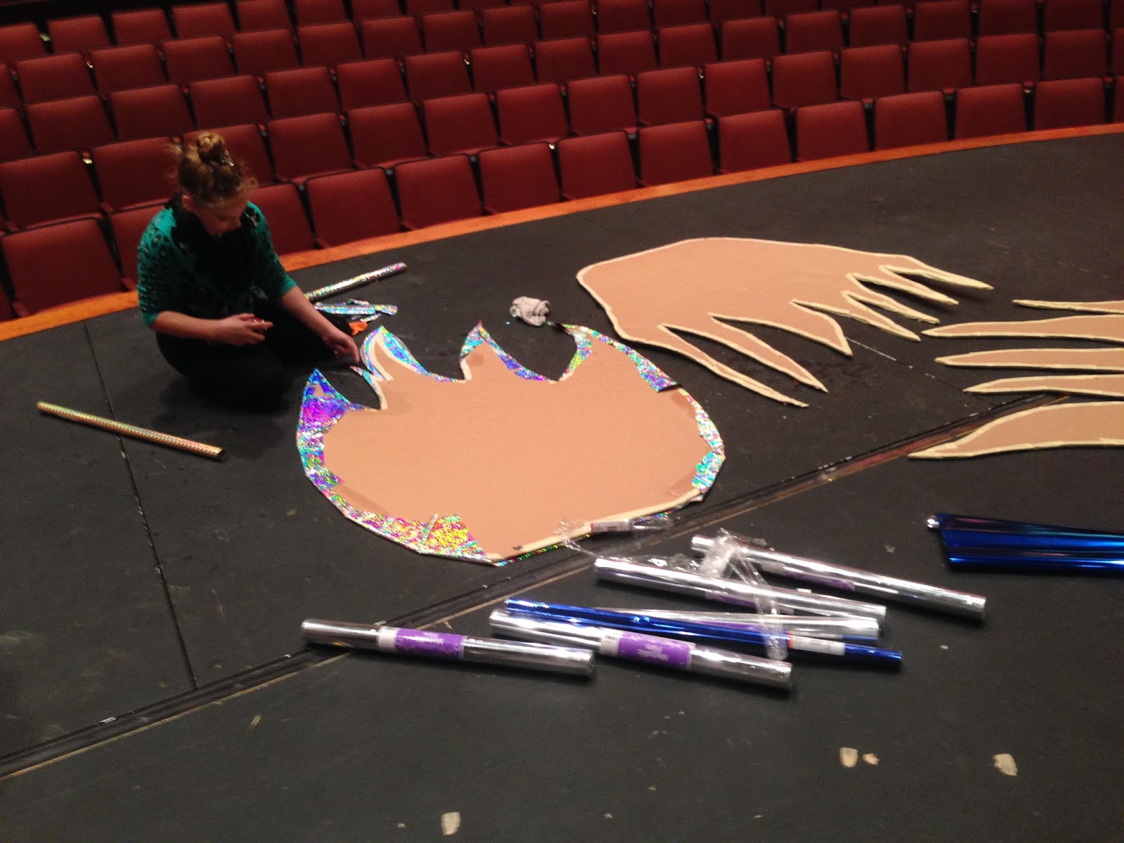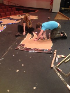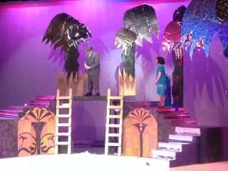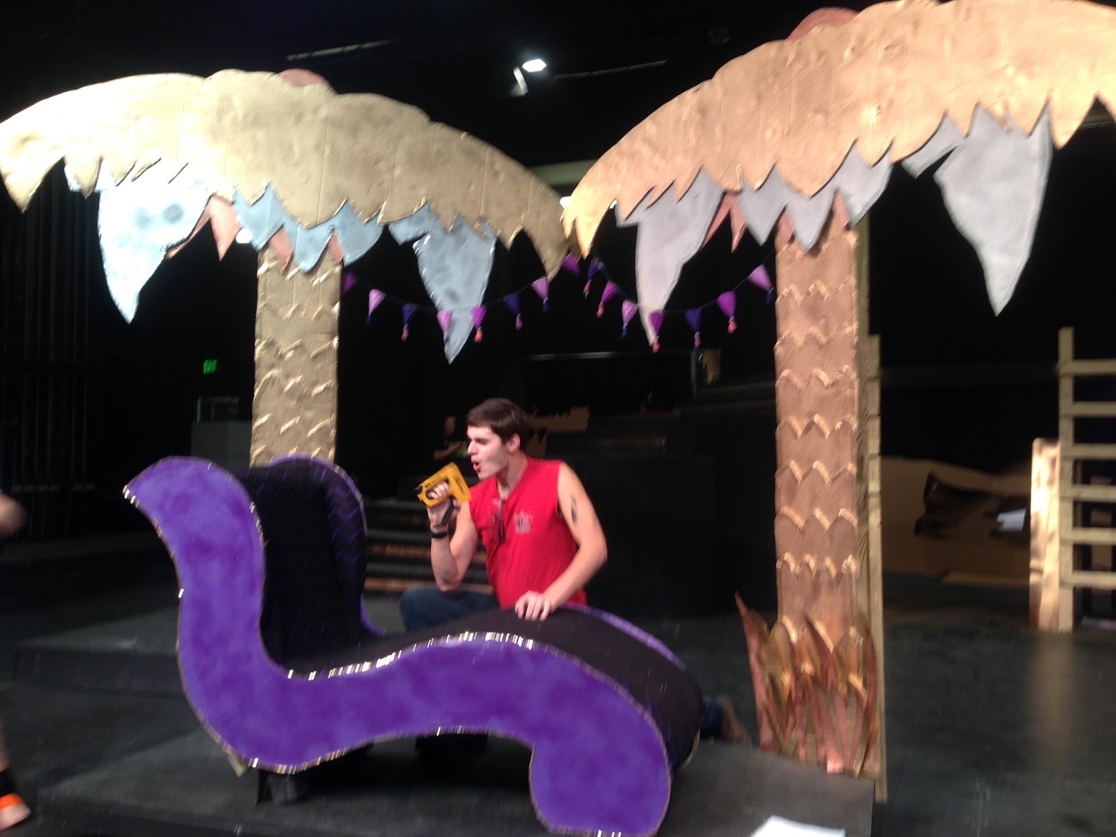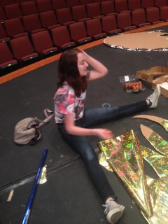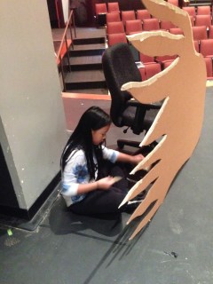 We created a sweeping staircase/bridge. We lined the stair case with mirrors. This proved to be harder than I expected. My problem came with the card board being flexible and the mirrors not being flexible. When the actors stepped on the stairs and the stair would flex but the mirror would not, the mirror would pop off. Of course, it didn’t help that the kids just blopped the liquid nail on the mirror rather than covering the mirror back from edge to edge.