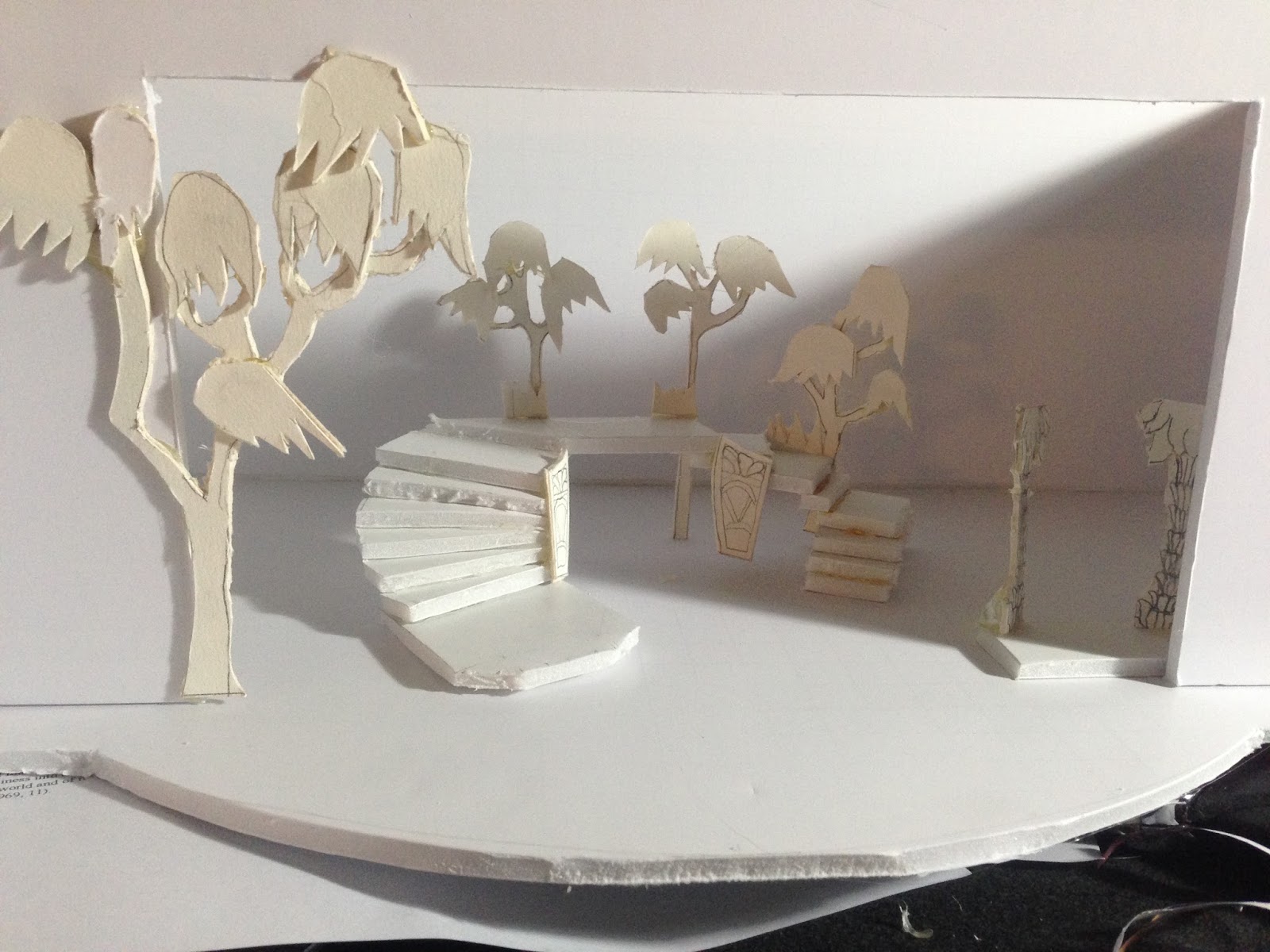 I started with my model. I am beginning to truly enjoy making models and solving the design issues on a small scale first. The director, my friend Jeff Witt, wanted the show to be set in the 1920’s and wanted the set to have an art deco influence. He and I researched some art deco art and architecture. We found some great pictures that inspired us – art deco palm trees and a great art deco bath tub. We were impressed with the use of mirrors and wanted to add mirrors to the set. I wanted to make things shades of gold and black and I wanted to use metalic surfaces are well.