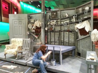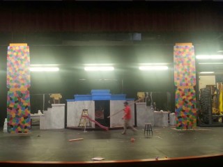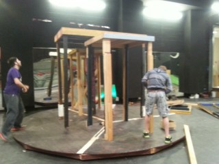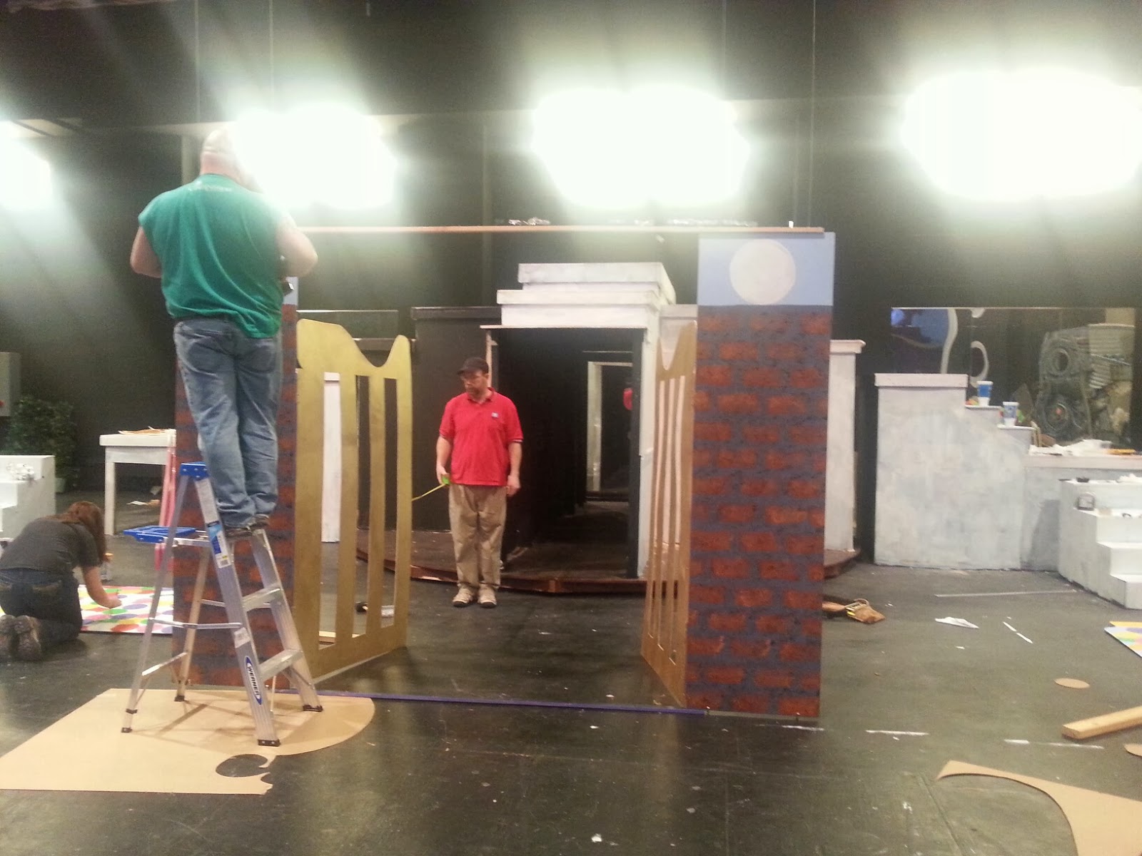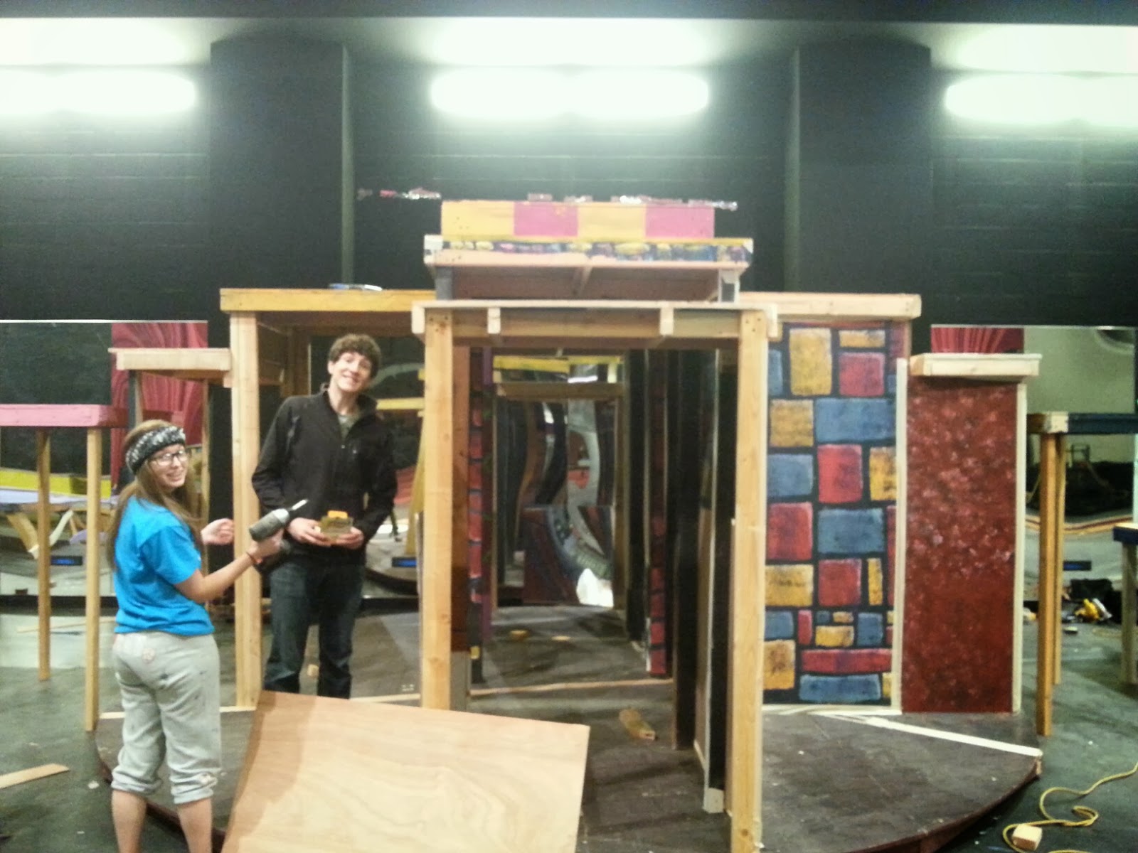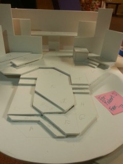 Hannah and I have been crazy busy with Les Miserables rehearsals. This is a picture of the model of the set that Tony Zandol designed. We taped the foot print to the floor. I was assigned several scenes to block. It’s like herding cats to get 45 people on and off and around that little set… but I manage. This past week I managed on my own. Robert was gone with his show at Howard Street Middle School (I did cart all out Little Mermaid stuff over to his school for that so you might be able to say that I made another set in all this chaos).