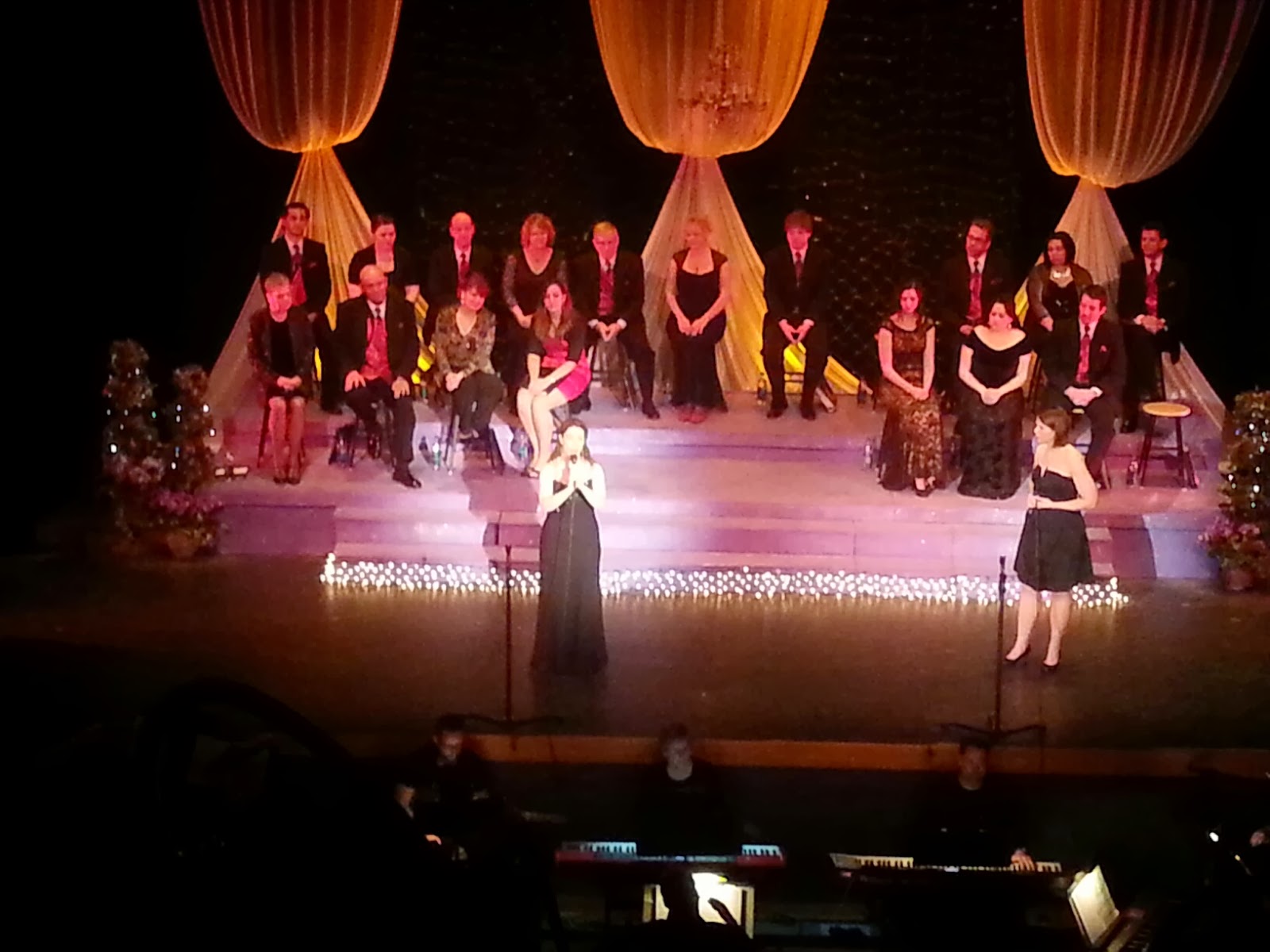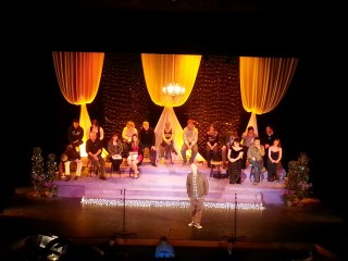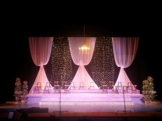 I also created this set for the Pentacle Theatre fund raiser A Star is Born. I made 3 trico curtains and knotted them and hung them so that they bunched. We found net Christmas lights and hung them between them. I built a platform to seat performers on. I got a chandelier for the theater and the bushes that were used in Secret Garden. It turned out great! I keep hearing that people were impressed.