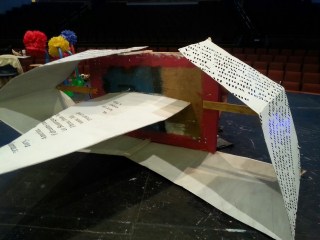 That didn’t work either! GAH! So far, the weight of the kids is too much for wheels to handle. At this pint we are going to have to take the shell off and put handles on the inside and make the kids walk it across the stage. Bummer.