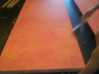 … paint the front edge and add the lattice to create the “outside” of the house look. It’s really a finishing touch thing, but I have to assign lots of kids jobs and they need to do things while walls are finished and paint is drying…I taught Emma to texture using a feather duster..