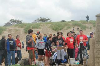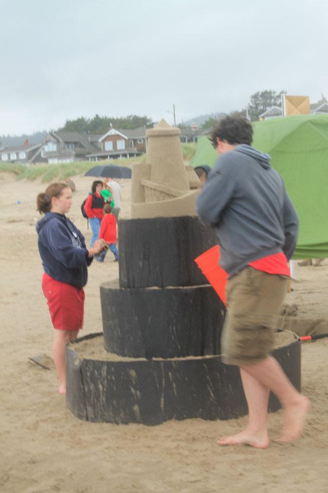 Saturday was the big Castle day. Kimber and I stayed at camp and made lunch for the castle people. We also had Ben and Lillian. John drove back home to Monmouth to a funeral. Everyone else joined the Jessops on their sand castle team. Sand castle start with forms (Jessops use felt roofing paper), sand and lots and lots of water. My family does the grunt work. They shovel sand, carry water, and stomp sand.It is a lot of work!