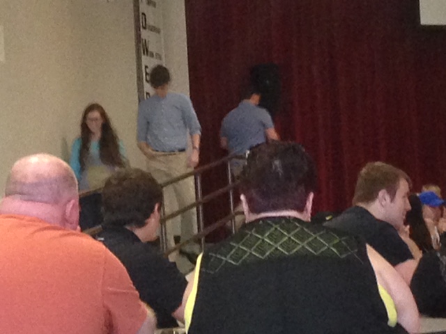 I ran sound. Dylan was sitting next to me holding down the umbrella. I asked him to take a picture of Hannah sitting there. He got this great shot, through the superintendence’s legs. LOL.