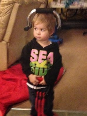 Ben is always good for a giggle. He likes to play with our exercise equipment when he comes over. He is very serious about his exercise routine… one most hold perfectly still in this exercise as one balances the push up bar on one’s head. Silly boy!