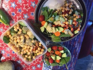 The salads were mixed greens from my garden, cherry tomatoes, cucumber from my garden, carrots, spinach, red bell pepper, garbanzo beans, artichoke hearts, stuffed olives, and almonds. I used Goddess dressing for these salads.