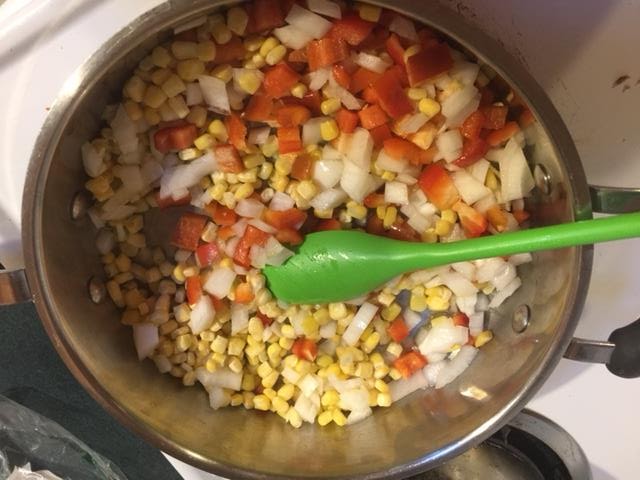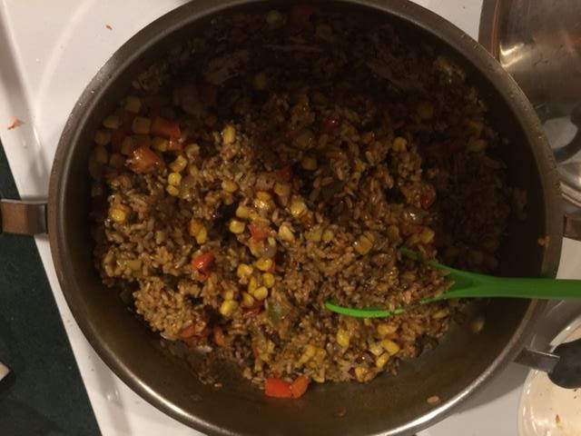 Mexican Corn Risotto is easy. I took 1 c frozen corn, 1/3 c chopped onion, 1/2 red bell pepper chopped, 1 small jalapeno, chopped and sautes them in a little olive oil (about 5 minutes). Then I added 1 c brown rice and 1 tsp chopped garlic and continued to saute the mixture for another 5 minutes. Then I added 3 c of vegetable broth and let it cooked. I covered it, but I would stir it often so it didn’t stick. When I was ready to serve it, I added pumpkin seeds.