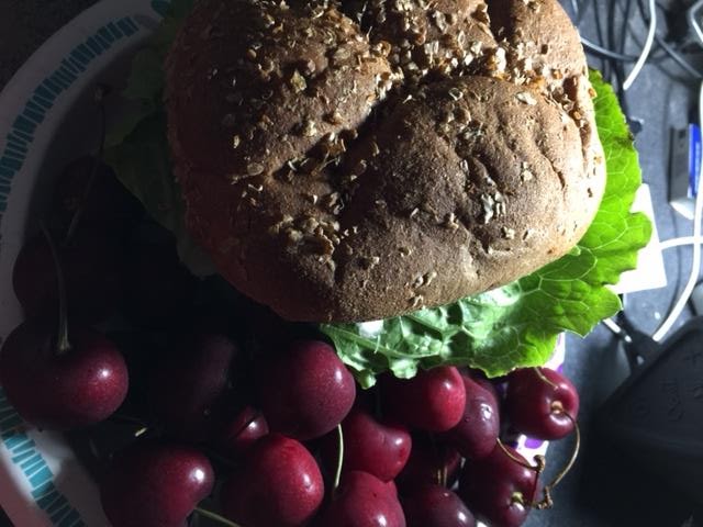 Lunch – Morningstar Veggie Burger with lettuce, tomato, Dijon mustard and onion, cherries