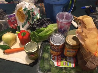 Breakfast – a fruit smoothie (I just throw a handful of fresh spinach, frozen strawberries, blueberries, a banana, 1 c of chai tea in a blender. It does the trick.