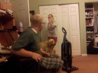 | Chad wearing Hannah’s Party Pants. I have no idea why they are called party pants. |