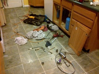 Meanwhile, there was a small disaster in the kitchen. I was standing there doing dishes and suddenly felt my toes become very warm and very wet. I wondered why there was no water pressure. The problem? The hose on the kitchen faucet had ruptured. John came home from work and tore into it. It took both of us to get the old faucet off the sink. He was up until after 1am working on it. Good thing too. Dishes can really stack up around here.