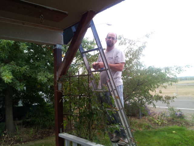 John worked some more on the front porch. This has been many weeks in the making. He wrapped all the poles with wood. He caulked all the cracks. Be chased out all the bees. He took out the bird’s nest. and he started to paint.