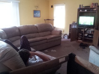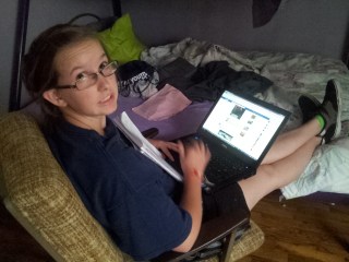 Saturday we all worked on projects. I went to the HS most of the day and worked on the play. I had wanted to finish the bathroom when I got home at 3 but John had the ladder. Instead, I planned the week’s menu and cleaned up after the people that had stayed home. Eventually, I made dinner and went shopping. Although Hannah had rehearsal, she came home to “do homework”. Look closely at the picture and you will see how that homework went.