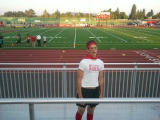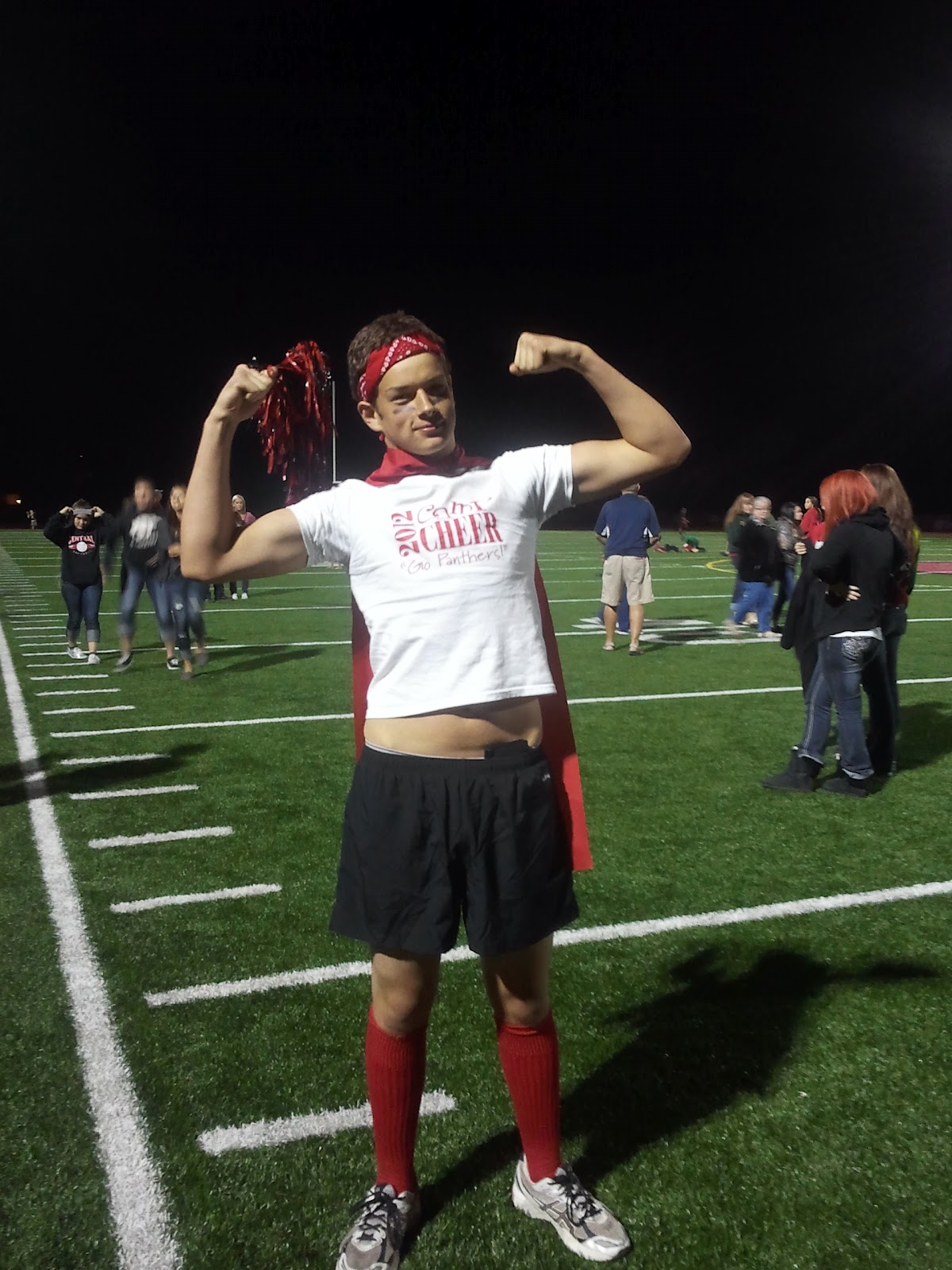 Chad has joined the “super Fans” of CHS football. He even came up with a costume… my red bandanna… Lillian’s Cheer Camp shirt… a scrap of red fabric from my sewing room… Raymond’s red socks… and my mascara under his eyes. At the games he acts like a nut. He does push ups when the team scores. He hasn’t done many push ups because they haven’t been scoring. He didn’t go to this weeks game because it was in Scappouse and his practice went long. The team lost.