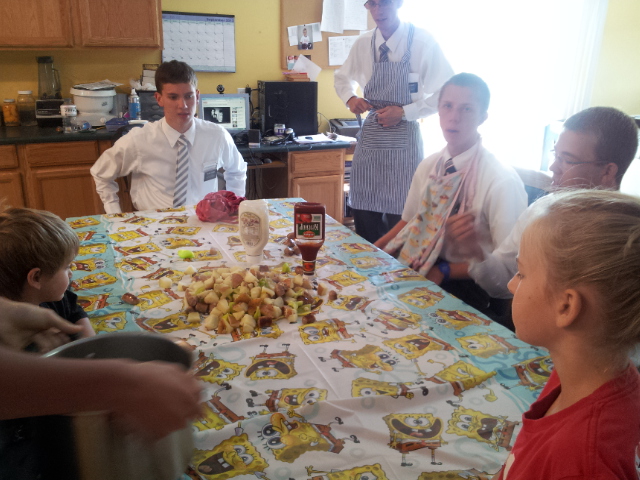 This week we served them Frogmore Stew. We learned this lunch from Myles. The missionaries were shocked when I dumped lunch straight onto the table and told them to dip stuff straight off the table. They begged for forks. I said no. hehehe. Some missionaries took us up on wearing the girly aprons. One decided that he was manly enough to stay clean.