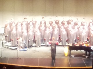 I only had my camera phone and I was clear at the top of the auditorium doing sound, so my pictures are lousy. This is Hannah’s first choir concert as a high school student. Her choir is fairly simple. I don’t believe it is very challenging for her. I wish she could move up to the more advanced choirs. The excuse is that freshmen need to pay their dues and stay down in the lower choir. Still… boys that are freshmen are in the jazz choir… and an 8th grade boy is in the jazz choir. It is disappointing. Oh well. She has friends in the class and is having fun most of the time.