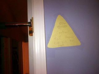 This week Lillian made this sign and taped it to the wall next to my bedroom door. It says, “Caution! Tall people can hit their head.” Of course it is written with all of Lillian’s creative spelling. The pull up bar moved from my bathroom door to my bedroom door because Chad thought it would be more convenient. meanwhile, Ray keep hitting his head… every time he walks into my room. Lillian was trying to help. LOL. Ray didn’t see the humor… or the help.