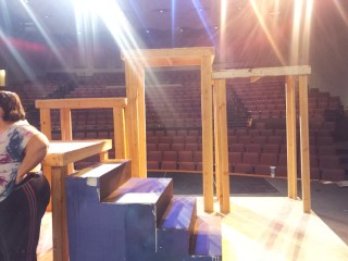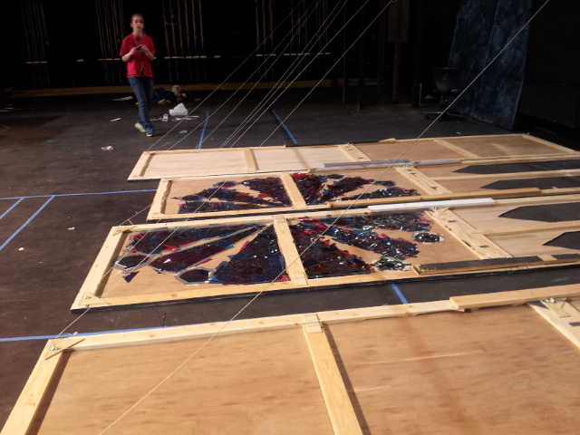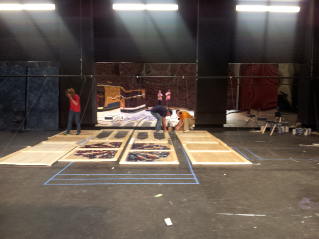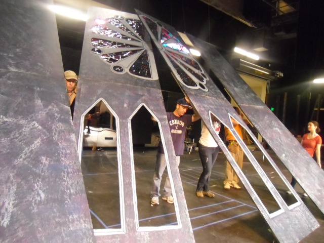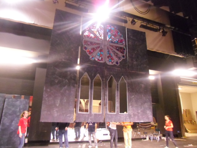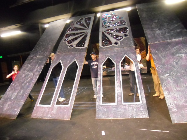 Saturday morning I stopped at my friend Julie’s for her to help my back problem. She is a miracle worker with her Bowen Technique. Then it was back to the HS for more set construction. This time I had John and Scot to help… along with way too many lazy kids. My main goal was to get the flying wall in the air so that the main stair structure could get into place. I over planned. first, the stain glass windows made with gel pieces took WAY TOO LONG! Mostly because these kids really don’t know how to work. At one time there was at least 15 kids working on them. Meanwhile, the men started working on the moving piece for the set and the Princesses bed.