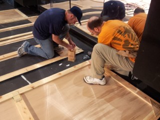I had Hannah call John at work and ask which size staples he packed for for me to use. He said the large ones. But they were having trouble going through the wood. I went over and turned up the air compressor. Even with the compressor at full pressure the staples struggled to make it through the wood frames. Finally, they were done with assembly and ready to staple on the skin. OOPS! We had stapled it to the floor! Hannah couldn’t stop laughing. Zane looked like he was going to hurl. Jeff was cursing under his breathe. I was amazed. Jeff and I pried it all the floor with a metal ruler. Little bits of tile were in bedded in the staples. I turned down the compressor and we moved construction to the stage. After we got 8 flats constructed we headed home. I was sore, but I went to back to the HS to watch the Tapasa girls play a basketball game. Sai can’t play right now. She was injured. But Mo did a great job and I had fun whooping for Mo’s hooping!