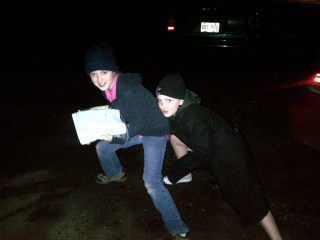 After John got done with a couple chores he took them to “ditch” their gifts on unsuspecting receivers. He caught this hilarious photo of the deed. Although I convinced him NOT to put the picture on Facebook so that their secret could remain a secret, I will put it in my blog. I can’t resist. Their Ninja skills had to be documented.