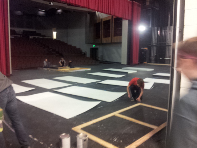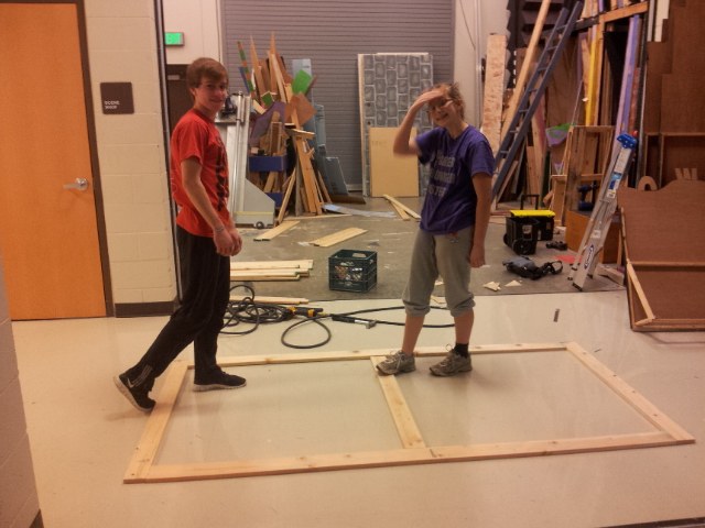 Friday, Hannah and I pack up all my NEW tools and toys and headed to Rickreall to buy all the lumber I thought I needed to build Once Upon A Mattress. I only had 3 Saturdays to get this set up and functional before Tech! I had some serious work to do. A few kids showed up and I put them to work. Hannah measured while I cut. We were building 8 new flats designed to FLY! I tried to get the rest of the kids to base coat the doorskin and to put legs on platforms so that I was ready for the next phase of construction. After getting all the pieces cut, Hannah and Zane worked at putting them together. The shop was a little messy so my friend Jeff moved the flat construction to the hallway.
