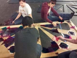 All this took FOREVER! I think what frustrates me most is that it doesn’t matter how many drawings I do, how many times I explain something, or how prepared I tried to be everyone either doesn’t understand the instruction or feels the need to re-design my ideas. Anyway, since the stain glass windows needed to be done before the wall flew we worked on pieces I wasn’t ready for. Some kids work well. A hand full of the kids painted, legged, cleaned up, took over the stained glass project, and the like. I’d take their help any day. So after 9 hours of work were finally ready to raise the wall.