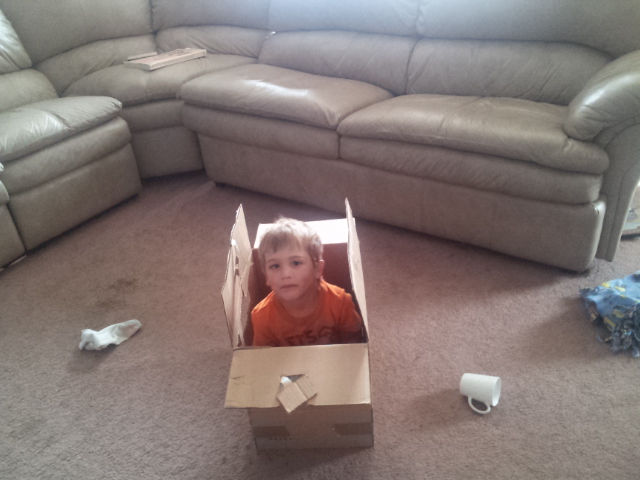 He usually is crabby for about 15 minutes and then he finds something to do. It never stops being amazing the wonders of a box. Seriously, when my kids were little I could have saved myself so much money and worry if I just gave them boxes to play with.