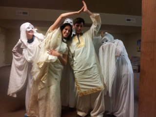 My costumer has started bringing in costumes. They look great! These are the two servants from India and 3 of my dancing spirit guides. I love them!