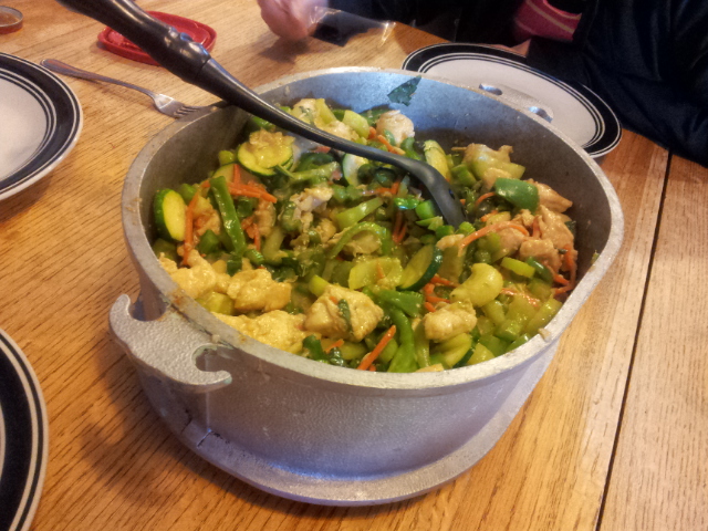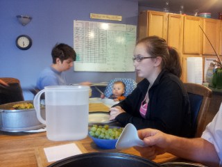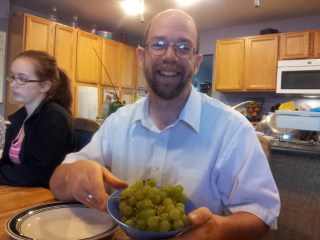 This Sunday meal was pretty remarkable. Most of it came, or could have come from our yard! We had grapes from the yard… our first harvest ever! The stir fry had green peppers, celery, green beans, and carrots from the garden. The chicken didn’t really come from the yard… but it could have. It was pretty fun to sit down and realise that we are getting more and more self reliant and more “green” or “clean” in what we eat.