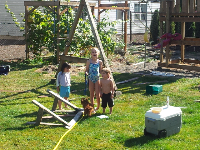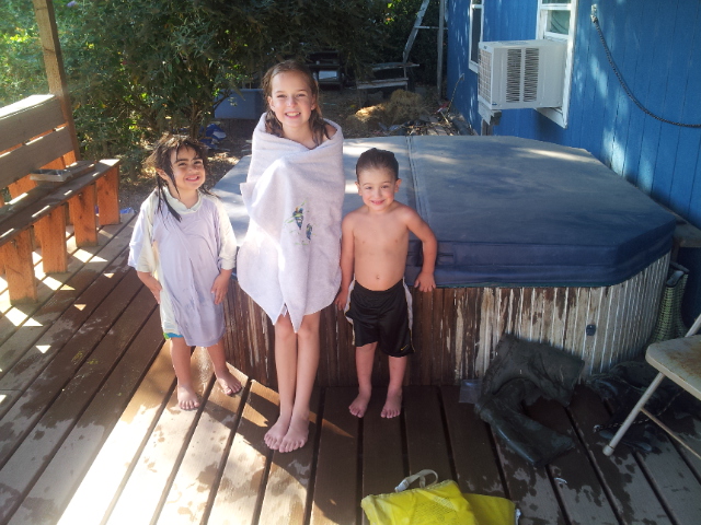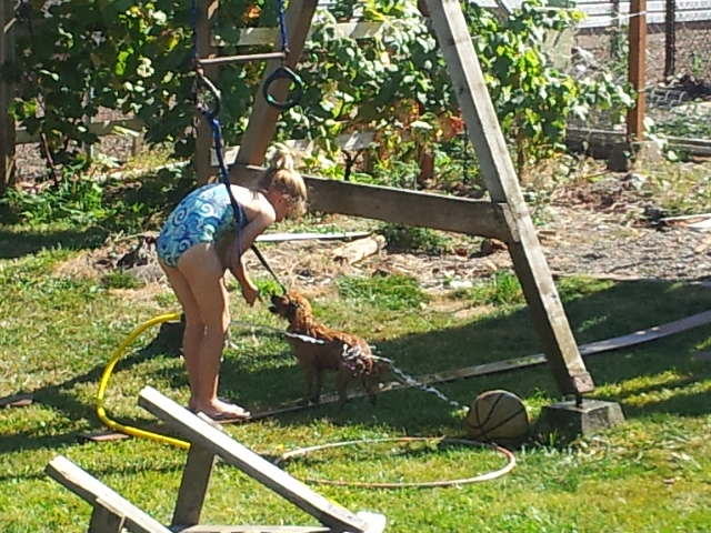 As long as they were already wet, they got to play in the hot tub. However, the next day they did not. Case and Lagi decided to break into the hot tub chemicals and dumped them all out! AGH~! Case was mad at me for saying no. He called me stupid. He got to taste soap for the first time.