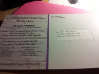 The biggest news of Friday was that the Wedding Announcements came in the mail. Hannah and I put the address stickers on the postcards. I made a few temple inserts too and put a few in envelopes. We also had to change the address for the reception in New Mexico.