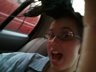 The next day wasn’t as bad. This time Kimber braided it backward and then sprayed and pinned the pony tail into a fin on the top of her head. It takes a long time to put up, but it is a good effect. It also can be washed out in the shower. Kimber also helped come up Hannah’s make up.