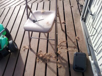More than leaves are falling around here. So is Case’s hair. His mom hasn’t found time to get him a hair cut and gave permission for McKay to give Case the hair cut. Laura figured that as long as Case would hold still for McKay it was worth a shot. McKay is silly. She let Case choose the clipper guard. He insisted on black and even through a huge fit when she tried to change it to orange. After the first couple of passes, Case got worried that he saw his hair fall to the ground.