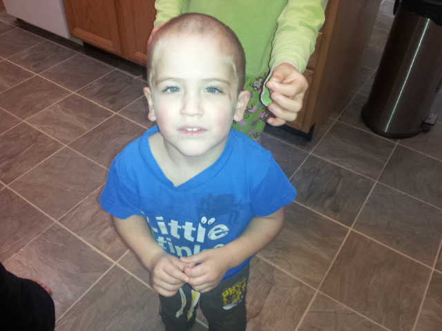 He kind of had good reason to worry! Here is the result. his mom’s reaction was, and I quote, “OH MY FREAKIN HECK!!!” She thought he looked like a girl. Some people said he looked like a cancer patient. We consoled his and told him that he looked like his brother Jacob when he got a Military hair cut. I think it’s a good thing. He doesn’t like to wash his hair. He doesn’t like to comb it either. I think this is a win-win hair cut.