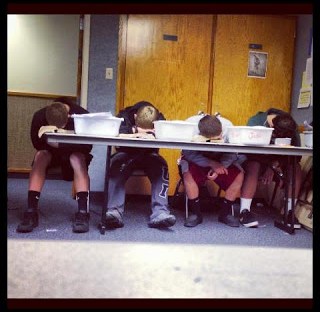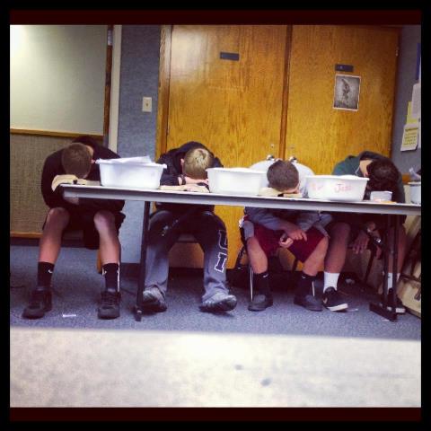 We are now three months into Seminary… and this is what I see. These boys sit right next to me. The sister of one of boys sleeping here snapped this picture and posted it on Facebook. She commented on how she had “caught” them in the act. Laugh is on her too. She is “caught” too! What was she doing with her cell phone out in class?! Teenagers!