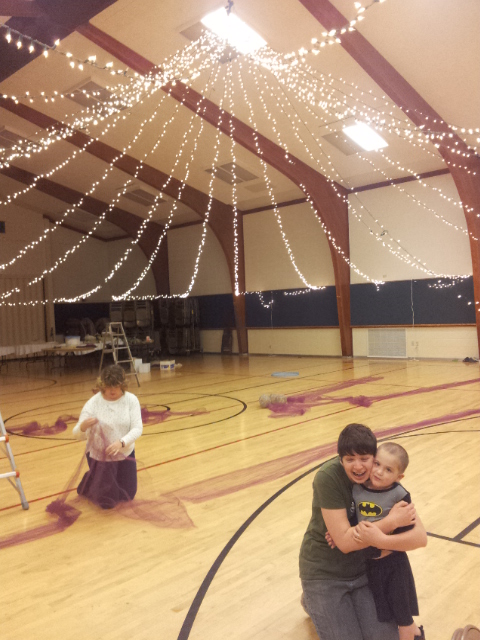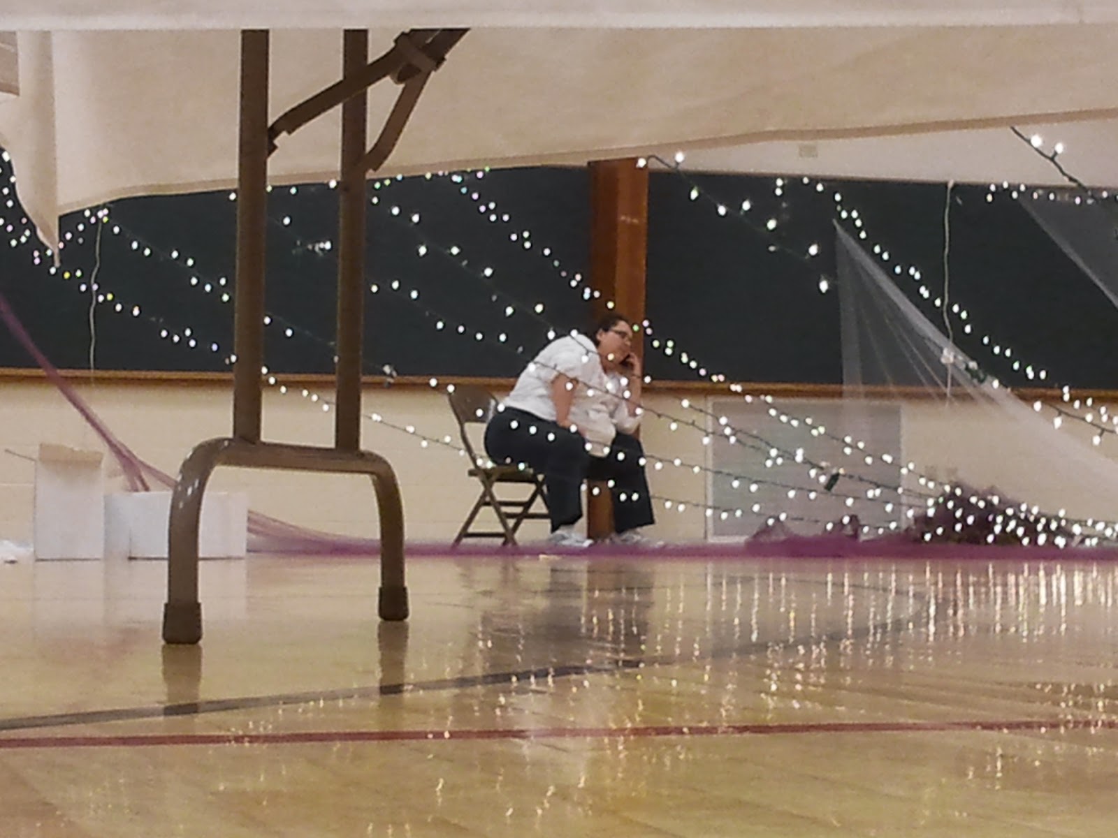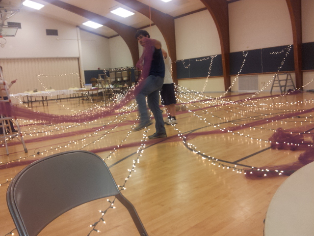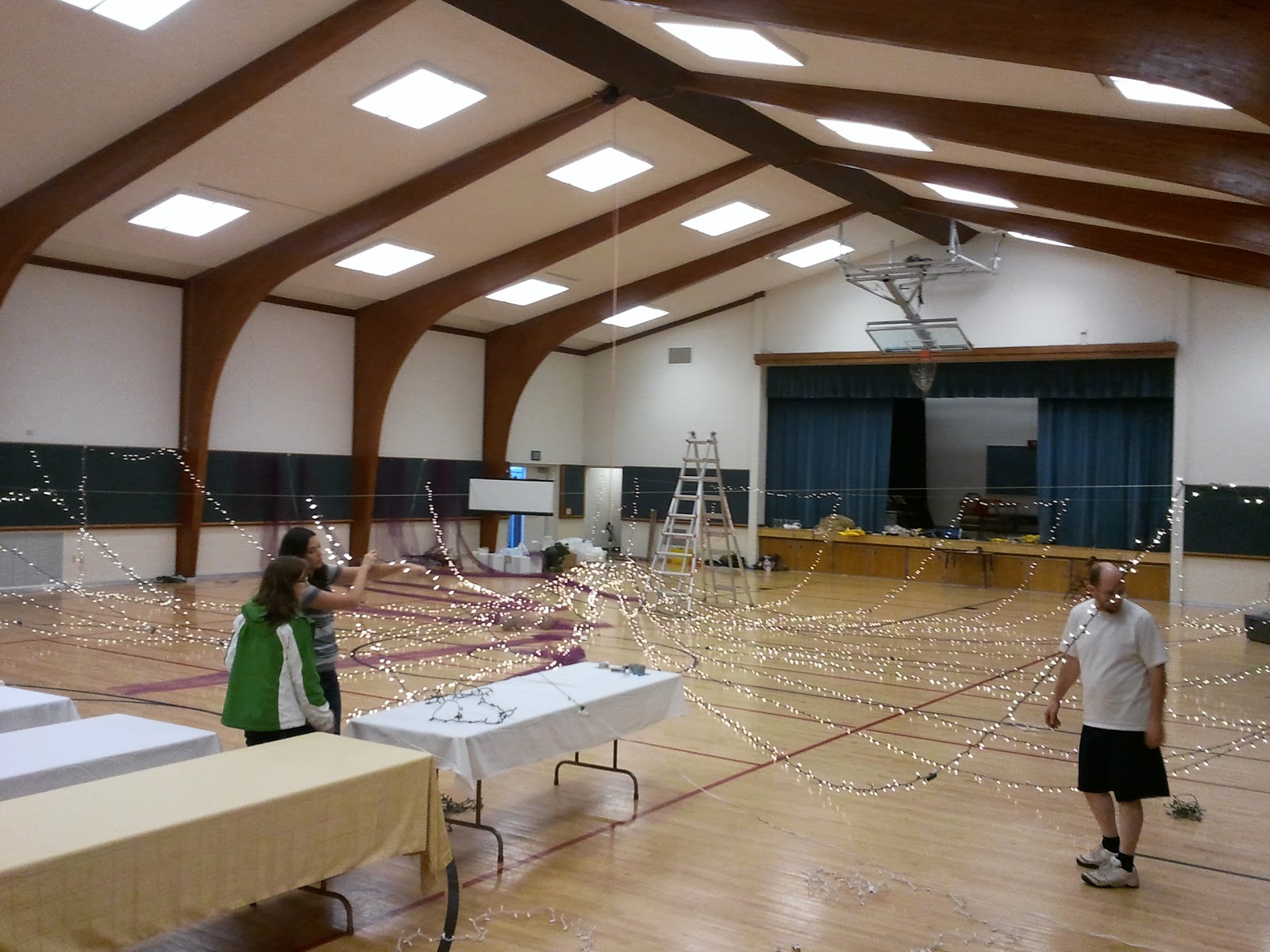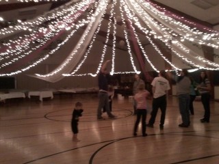 After breakfast, we headed up to the church to start preparation for the big par-tay to celebrate McKay and Myles getting married. I am not a fancy person, but McKay is, even if she doesn’t admit it. Kimber and our good friend Megan had searched Pintrest for ideas and we finally had an idea that we thought we could do that would make McKay happy. I gathered all the goods… lights from friends and tulle and vines and vases from even more generous friends. Megan and I also scored with stuff often used for Prom with bird cages, fancy lighted trees, balls of flowers, and lamp posts.