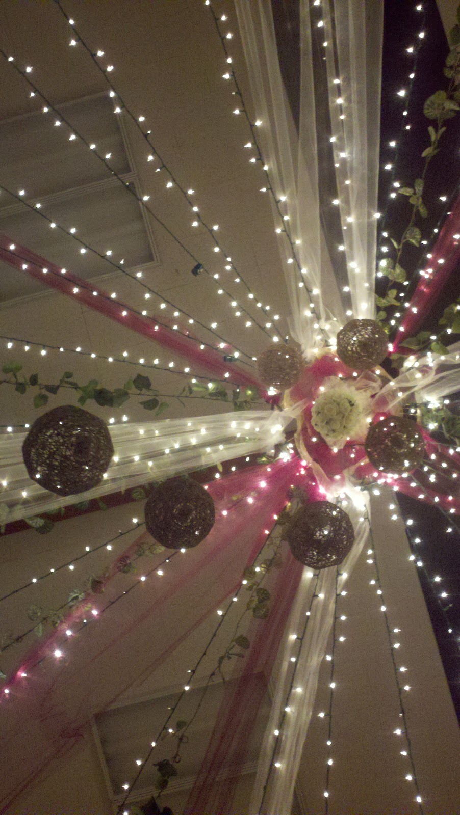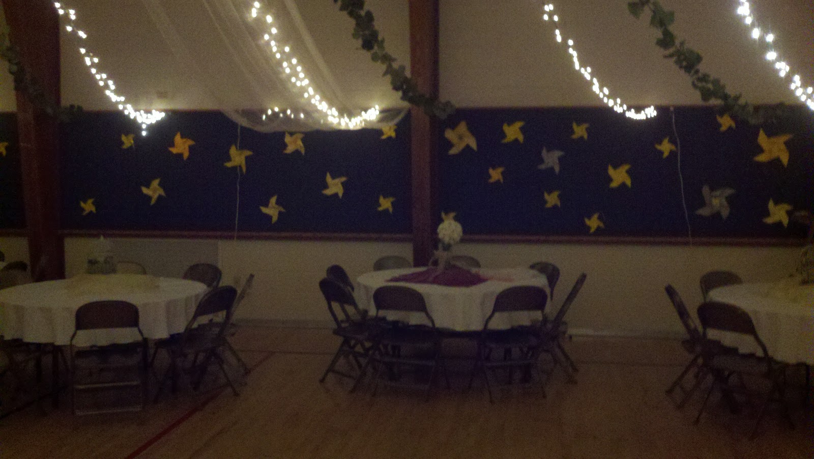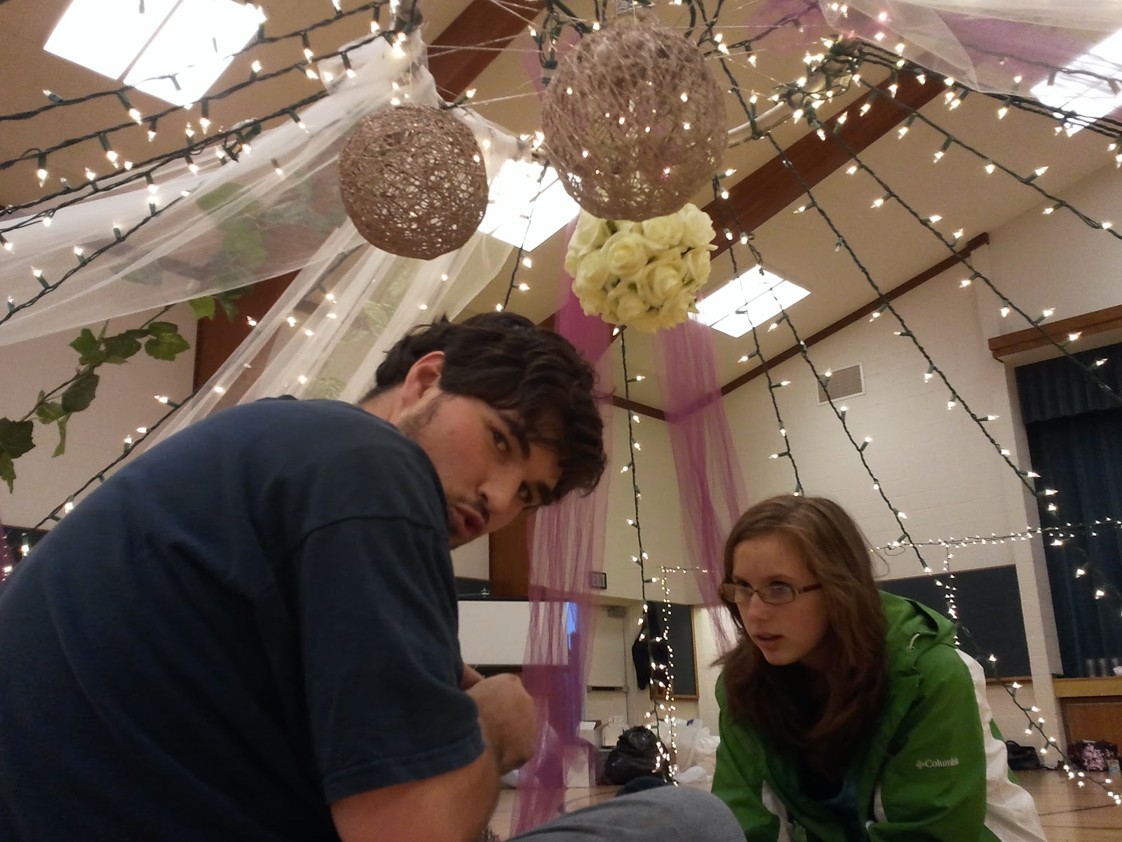 After breakfast, we headed up to the church to start preparation for the big par-tay to celebrate McKay and Myles getting married. I am not a fancy person, but McKay is, even if she doesn’t admit it. Kimber and our good friend Megan had searched Pintrest for ideas and we finally had an idea that we thought we could do that would make McKay happy. I gathered all the goods… lights from friends and tulle and vines and vases from even more generous friends. Megan and I also scored with stuff often used for Prom with bird cages, fancy lighted trees, balls of flowers, and lamp posts.