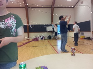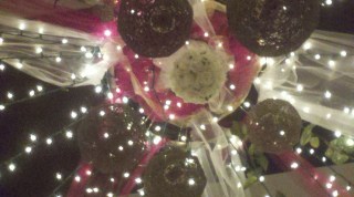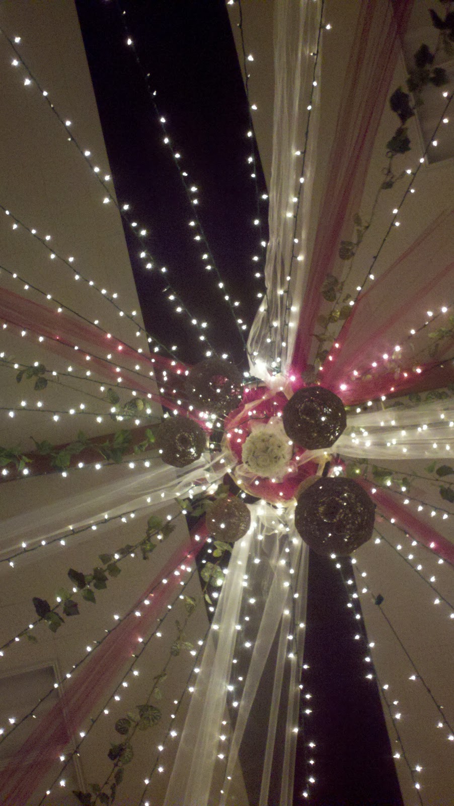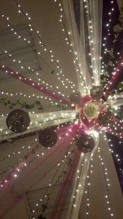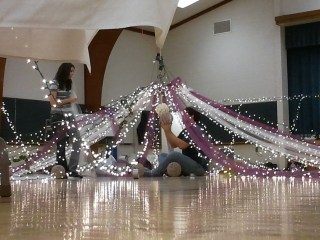 Megan cracked the whip and got everyone working… John and Ray were assigned to build the canopy. They started with a hula hoop. It just wasn’t working. Ray mumbled to himself that he wished he had a bike rim. John had one laying around. Go figure. He ran down the street and they were off and running. Meanwhile, MaryJane, Connor, Ethan, Hannah, Kimber, Heather, McKay, Myles and myself started to lay out vines, lights, tulle. Myles mom, sisters and brother helped for a little while but they left before lunch. When we came to a standstill we worked on setting up tables and tying bows on the bird cages, table clothes, lighting for the tables and the like.