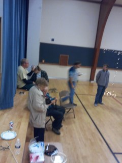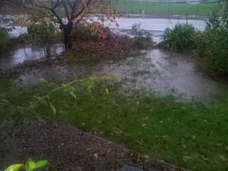 Jim had gone to get Grandma and Grandpa Boyack from the airport. I ran for pizza… and the rain began to POUR. I was a soggy drown rat by the time I got back to the church with lunch. Within an hour the parking lot was beginning to fill. This is a problem. We live down stream!