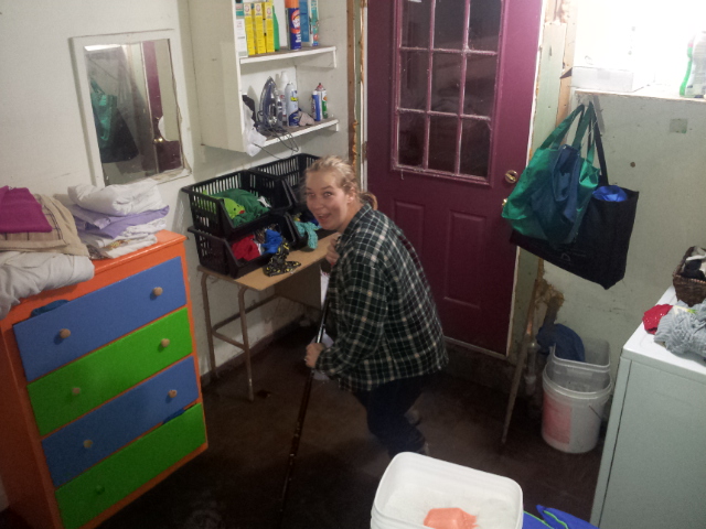 I couldn’t call my VT. One was working on the food for the wedding. I was watching my other VT little boy while she worked. We were shoveling water when she came to get him. My HT were not around either. One is moving to Pennsylvania and one never answered his phone. I tried to call lots of other people. No one was home. I finally called Yvonne. She got Isaac and Jacob and they went to Marr Court. Isaac waded out to the drain, around 3 feet deep, to unclog it. The water level didn’t change much. They came around to our house with sandbag. We thought that we might slow things down if we stopped the water from flowing into the air vents in the foundation.